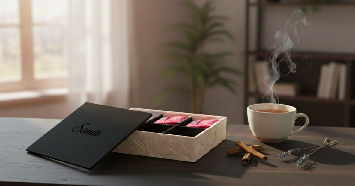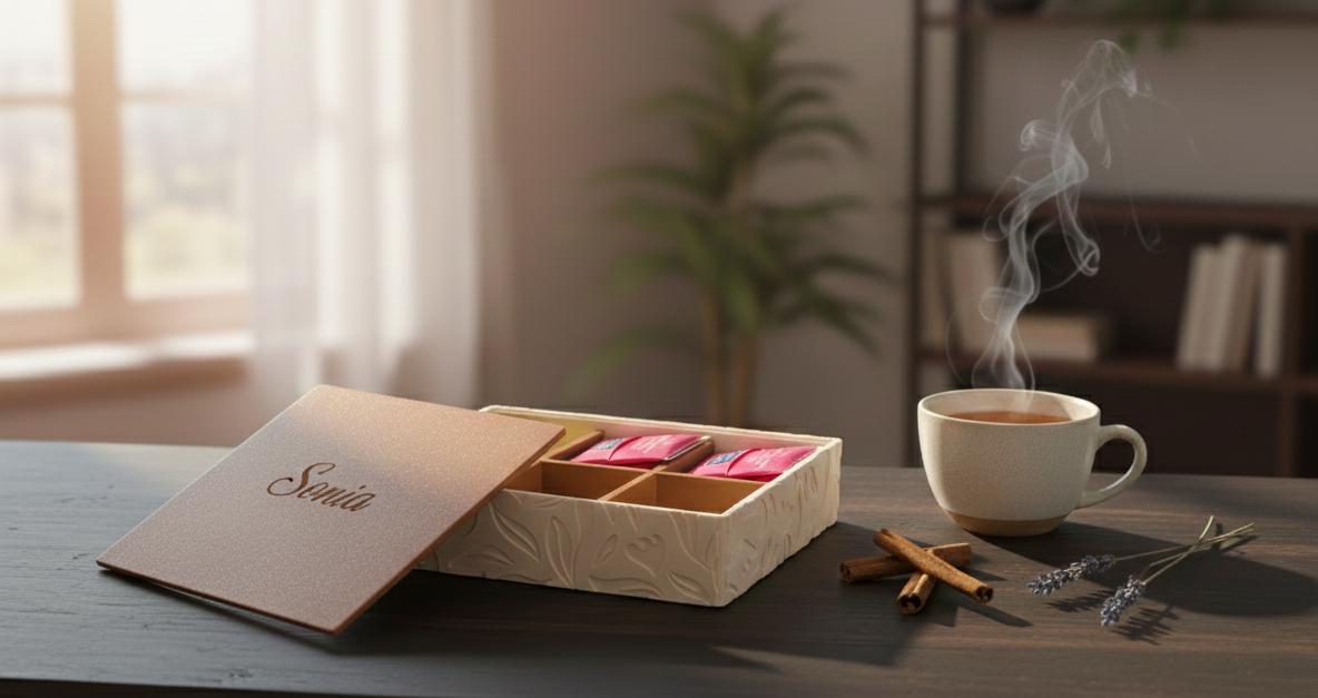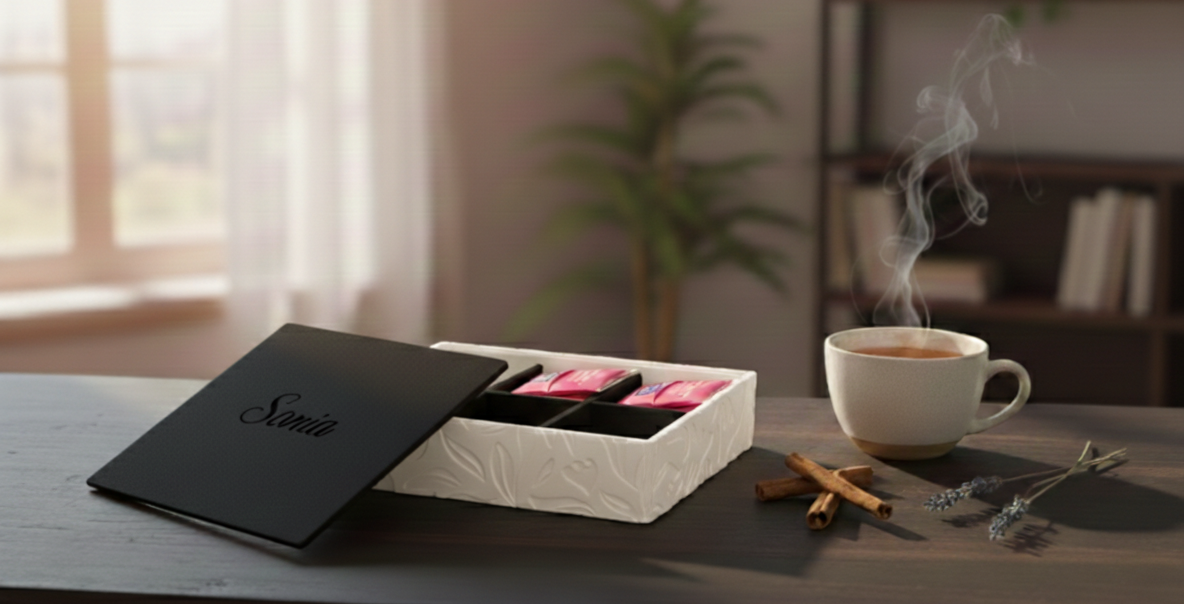 Découvrez notre boîte à thé personnalisable, conçue pour transformer un simple moment de détente en une expérience de luxe. Chaque boîte arbore un motif floral en relief offrant un toucher texturé unique.