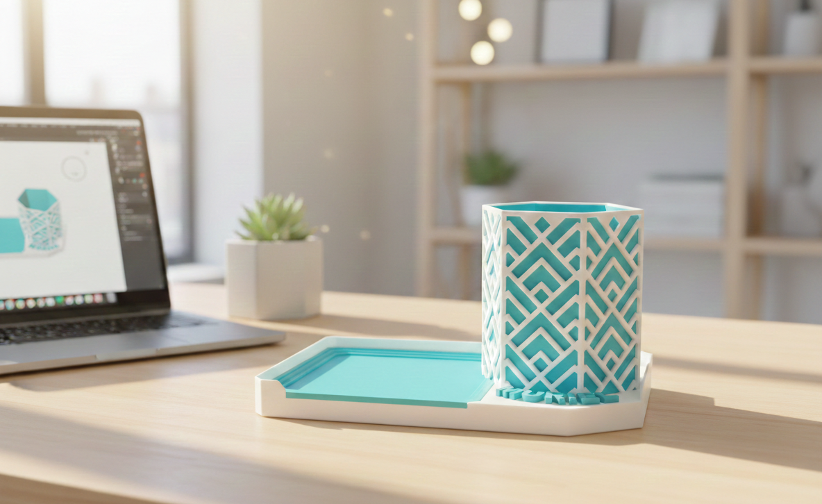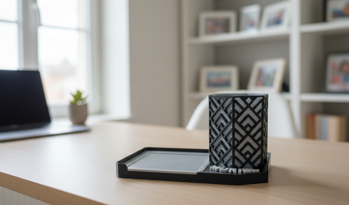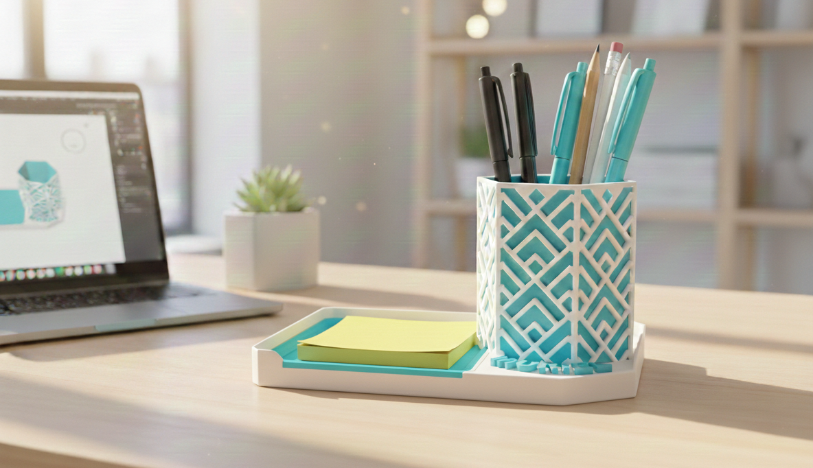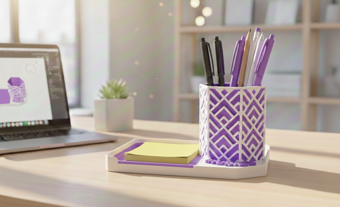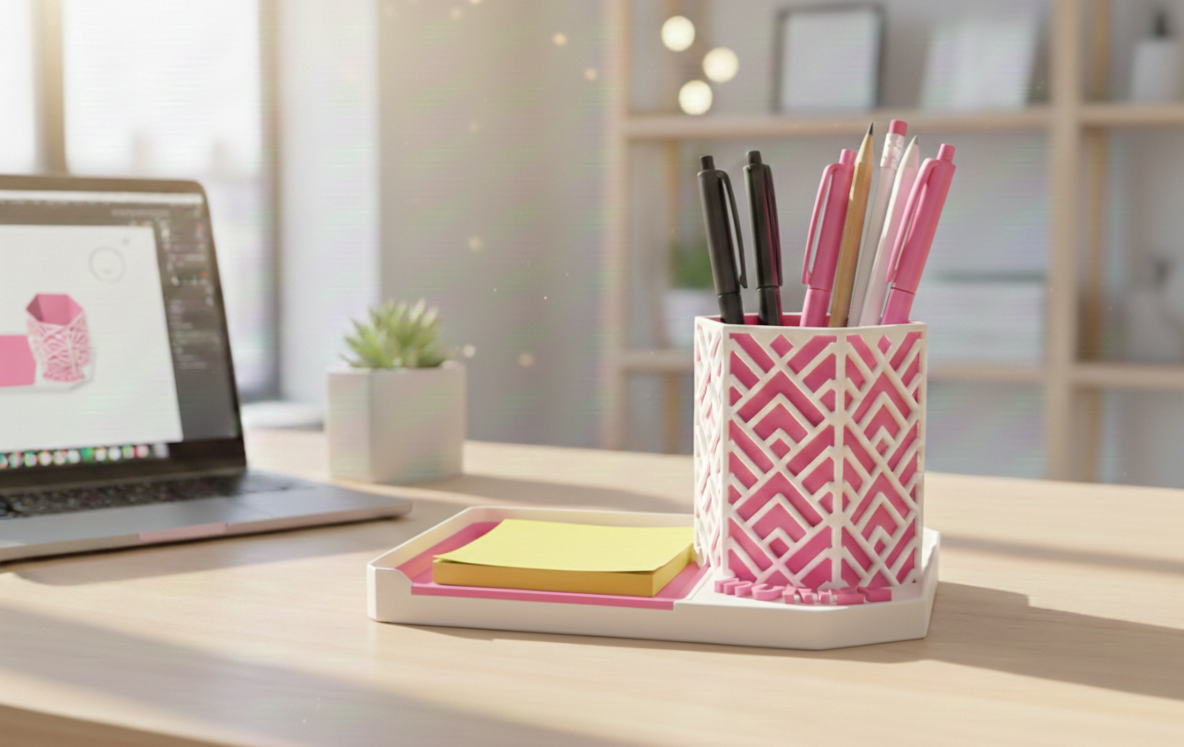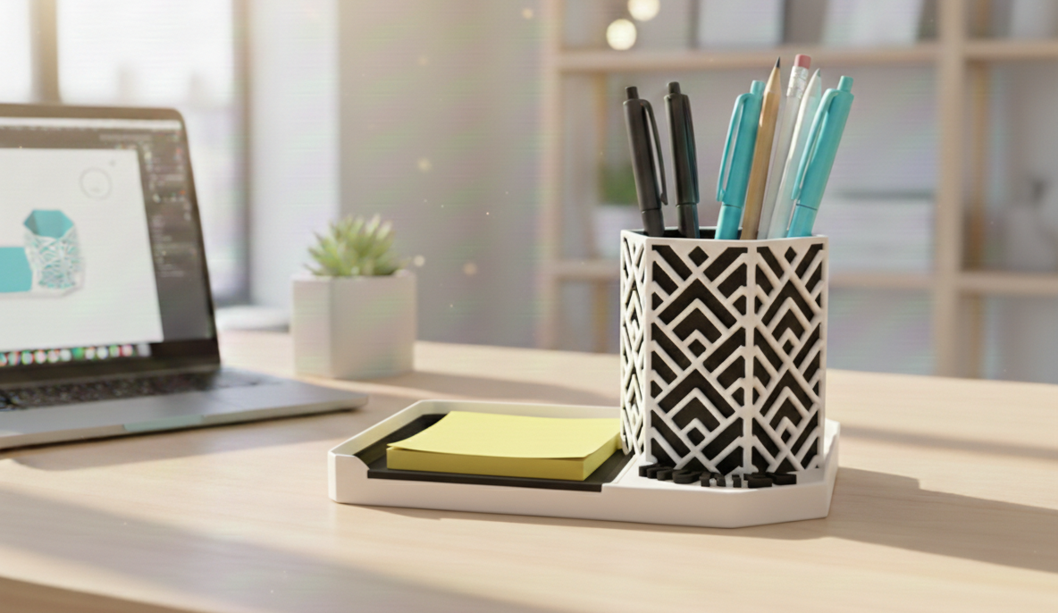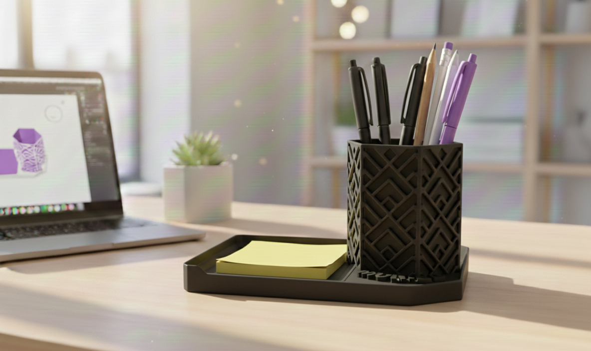 Marre des bureaux encombrés ? Apportez une touche d’architecture moderne à votre quotidien avec notre porte-crayon Hex-tour. Cet objet combine un pot à crayons hexagonal au motif treillis complexe et un plateau intégré parfaitement dimensionné pour vos post-its ou petits accessoires (trombones, clés USB).