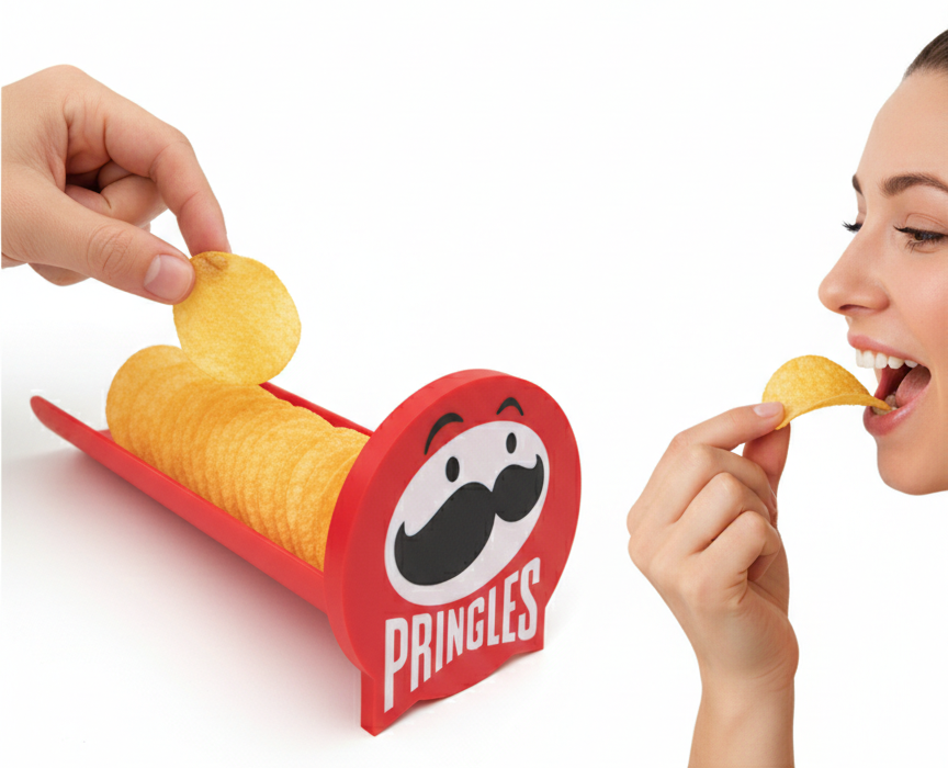 Bien que son design rappelle les célèbres boîtes rouges, l’Ascenseur à Chips est un accessoire universel. Il a été conçu pour s’adapter à tous les formats de tubes de chips cylindriques standards vendus dans le commerce :